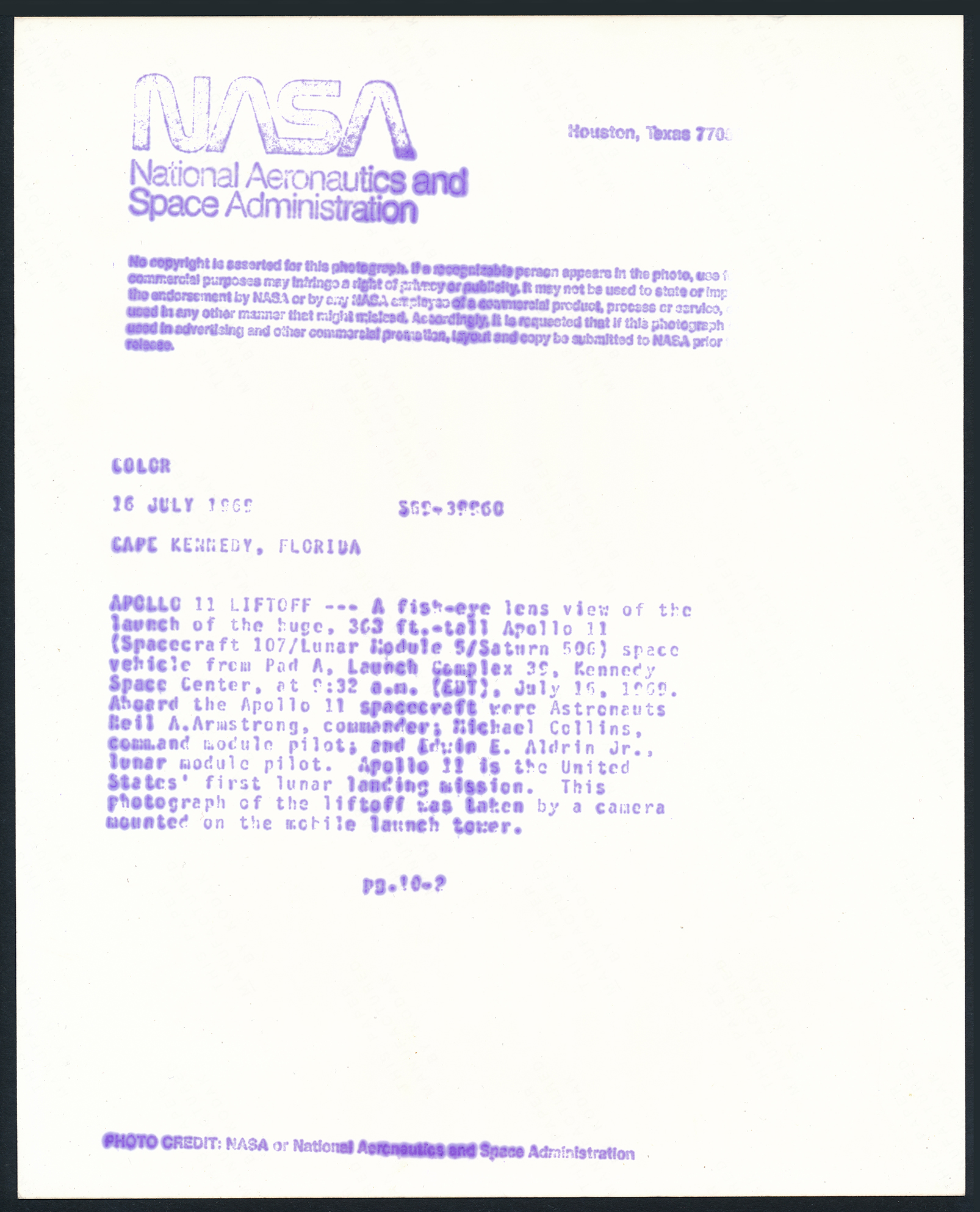 Tirage chromogénique sur papier : “THIS PAPER MANUFACTURED BY KODAK”. Logo NASA et numérotation dans la marge sur le devant. Logo NASA et légende tapuscrite au dos. 25,4 x 20,3 cm avec marges.
